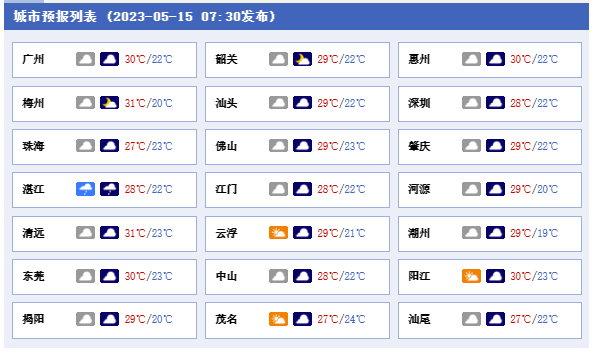 15日,粵西市縣陰天到多云有陣雨,其余市縣陰天到多云,局部陣雨。最高氣溫:粵西、珠三角西部市縣和梅州27℃~29℃,其余市縣25℃~27℃。