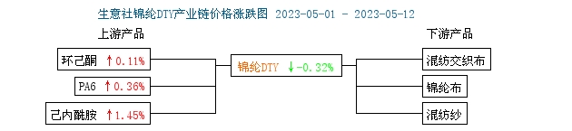 上周(2023年5月8—12日),下游需求跟進(jìn)一般,原料端變化不大,錦綸長絲窄幅下滑。供應(yīng)端來看,錦綸行業(yè)開工維持穩(wěn)定,貨源供應(yīng)量充足;從下游來看,下游及終端領(lǐng)域需求跟進(jìn)良好,但整體市場仍處于供大于求狀態(tài),下游需求仍觀望心態(tài)居多,雖然已經(jīng)進(jìn)入傳統(tǒng)旺季,但需求仍不如預(yù)期,按需跟進(jìn)為主。