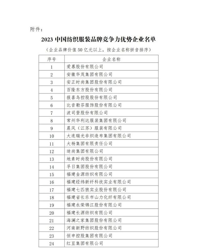 論壇上發(fā)布的“2023中國(guó)紡織服裝品牌競(jìng)爭(zhēng)力優(yōu)勢(shì)企業(yè)”(名單后附),無(wú)一不是其中的杰出代表。中國(guó)紡織工業(yè)聯(lián)合會(huì)副會(huì)長(zhǎng)楊兆華在現(xiàn)場(chǎng)介紹說(shuō),通過(guò)系統(tǒng)評(píng)估,共80家企業(yè)品牌價(jià)值超過(guò)50億元,確定為“2023中國(guó)紡織服裝品牌競(jìng)爭(zhēng)力優(yōu)勢(shì)企業(yè)”。