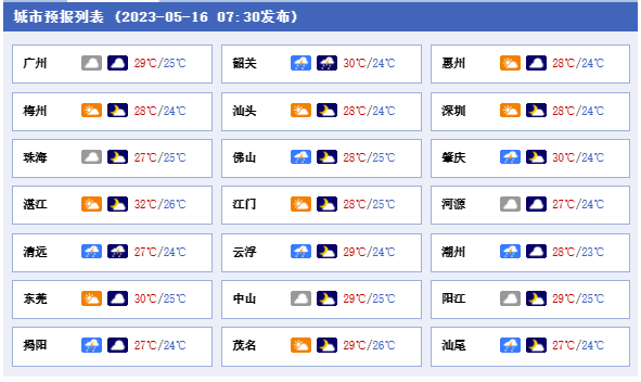 16日,韶關(guān)、清遠多云到陰天有(雷)陣雨,珠江三角洲中南部和粵東沿海多云間陰,有分散(雷)陣雨,其余市縣多云間陰天。最高氣溫:粵西、珠三角西部市縣28℃~31℃,其余市縣25℃~28℃。