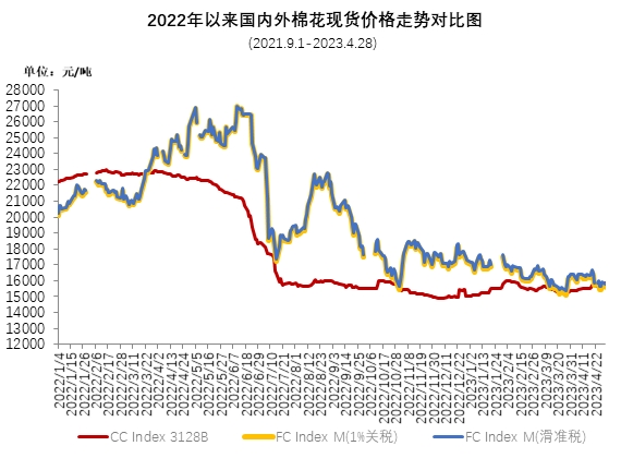 4月,國際棉價小幅上漲,月初美棉簽約裝運數(shù)據(jù)整體表現(xiàn)良好,美棉春播受不利天氣影響預期減產(chǎn),ICE期貨穩(wěn)中上行至85美分,月中受美聯(lián)儲加息、消費者信心指數(shù)下降等因素影響下跌,下跌至80美分以下,月底回升至80美分后持穩(wěn)。4月,ICE主力合約月均結算價在81.71美分/磅,環(huán)比上漲1.0%。中國進口棉價格指數(shù)FCIndexM月均為95.01美分/磅,環(huán)比上漲0.13美分;月底為93.28美分/磅,環(huán)比下跌3.62美分,1%關稅下折人民幣15749元/噸,低于同期國內現(xiàn)貨70元,內外棉價價差擴大818元。
