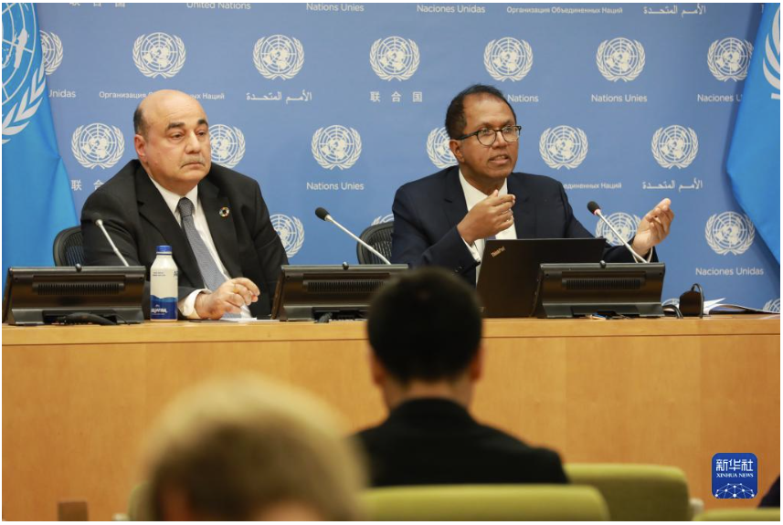 5月16日,在位于紐約的聯(lián)合國總部,聯(lián)合國《2023年世界經(jīng)濟形勢與展望》年中更新報告領(lǐng)銜作者哈米德·拉希德(右)在報告發(fā)布會上作介紹。新華社記者 謝鍔 攝