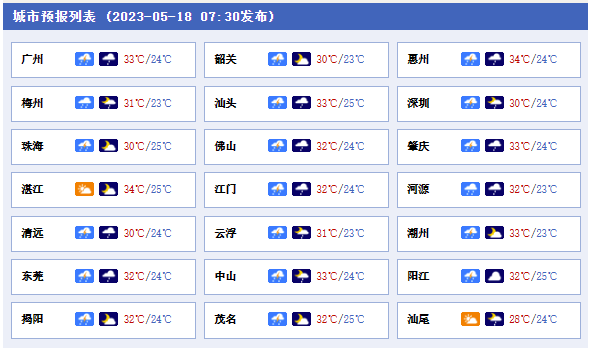 18日,梅州、河源和珠江三角洲的北部市縣中到大雨局部暴雨,珠江三角洲的南部沿海市縣有(雷)陣雨局部大雨或暴雨,其余市縣陰天到多云,有分散(雷)陣雨局部大雨。最高氣溫:粵西、粵北和珠三角西部市縣29℃~32℃,其余市縣26℃~29℃。