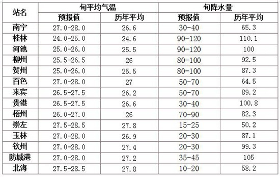 全區(qū)旬平均氣溫、旬降雨量預(yù)報如下: