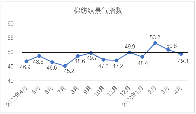 4月,企業(yè)信心指數(shù)為48.6,較3月下降0.1,位于榮枯線下方。當前,全球經(jīng)濟面臨的風險有增無減,外部壓力持續(xù)增加,紡織外貿(mào)市場恢復(fù)仍需時日。國內(nèi)經(jīng)濟處于恢復(fù)階段,內(nèi)需市場發(fā)展空間雖大,但競爭較為激烈。臨近傳統(tǒng)紡織淡季,棉紡織企業(yè)對于后市發(fā)展謹慎觀望,整體信心略顯不足。