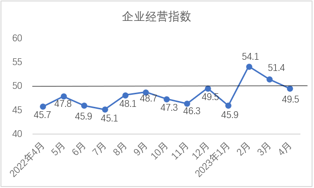 4月,企業(yè)經(jīng)營指數(shù)為49.5,較3月下降1.9,位于榮枯線下方,景氣水平欠佳。當月,外銷訂單維持低迷,內(nèi)銷訂單競爭加劇,上游原料價格的上漲并未帶動下游產(chǎn)品價格的跟漲,企業(yè)維持微利運行,經(jīng)營持續(xù)承壓。從構(gòu)成企業(yè)經(jīng)營指數(shù)的分項指標看,主營業(yè)務(wù)收入指數(shù)為49.0,較3月下降3.0;利潤總額指數(shù)為49.0,較3月下降0.8。