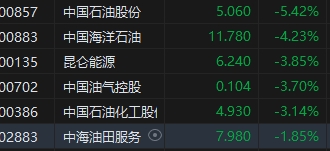 石油股普跌,中石油跌超5%,中海油跌超4%,中石化跌超3%,消息面上,周二國際原油期貨結(jié)算價跌超4%。 WTI原油期貨收跌3.21美元,跌幅4.31%,報69.54美元/桶。布倫特原油期貨收跌3.41美元,跌幅4.19%,報73.87美元/桶。
