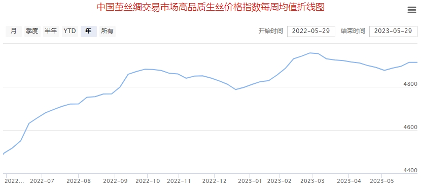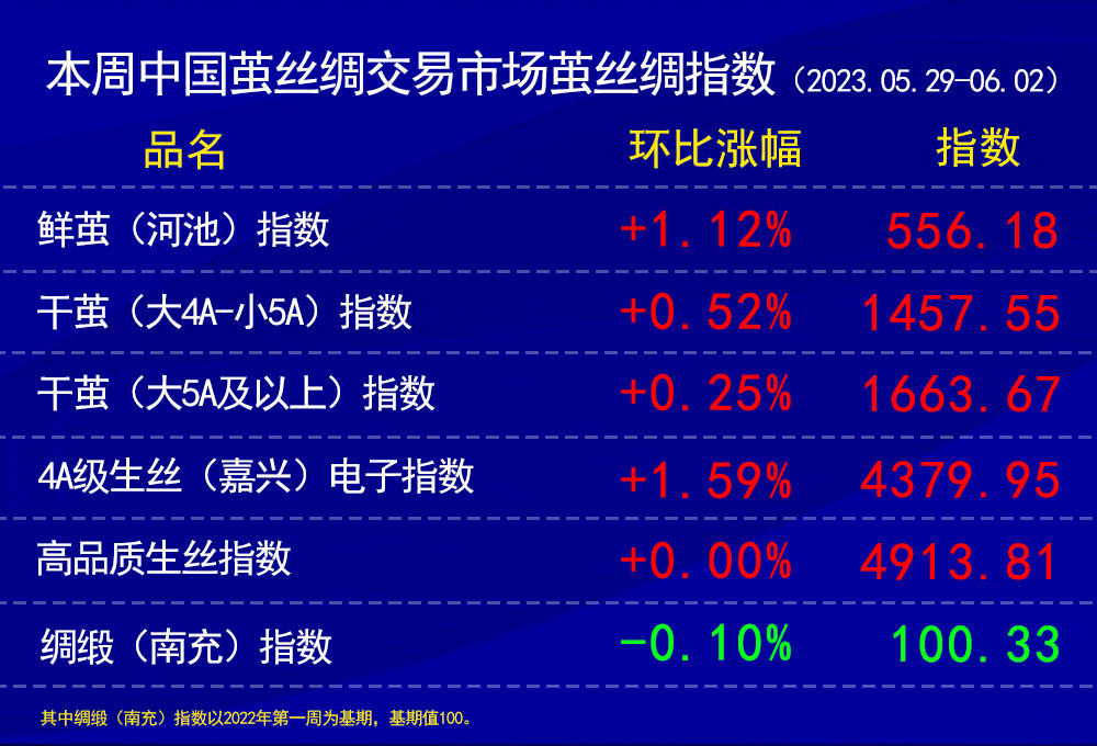 高品質(zhì)生絲指數(shù)上,本周協(xié)作單位成交一般,成交價(jià)格變化不大。部分單位幾乎全員投入蠶繭收購(gòu)工作。