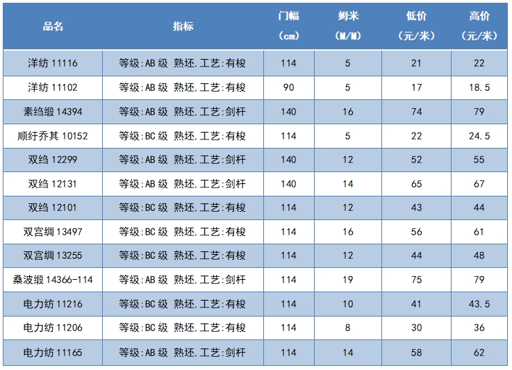 本周綢緞指數(shù)協(xié)作單位成交價(jià)格區(qū)間
