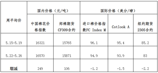 上周(5月22日-5月26日),國內(nèi)棉價先漲后跌,周初延續(xù)前一周漲勢,24日現(xiàn)貨價格創(chuàng)今年以來新高,后期跟隨國際而下跌。國際市場受美聯(lián)儲加息預(yù)期再次回升、美國債務(wù)上限談判沒有取得進(jìn)展、美棉出口銷售數(shù)據(jù)下滑等因素影響,棉價出現(xiàn)連續(xù)下跌,周五因中美商務(wù)部長會晤有所反彈,全周整體下跌。上周中國棉花價格指數(shù)(CCIndex 3128B)周均價為16570元/噸,環(huán)比上漲249元;Cotlook A指數(shù)周均價93.9美分/磅,環(huán)比下跌1.5美分,1%關(guān)稅下折人民幣15860元/噸(含200元/噸港口費(fèi)用),比中國棉花價格指數(shù)(CCIndex 3128B)低710元,價差較前一周擴(kuò)大626元;鄭州期貨主力合約CF309周均價15871元/噸,環(huán)比上漲106元;ICE棉花期貨近期合約周均價83美分/磅,環(huán)比下跌2.2美分。
