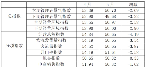 數(shù)據(jù)顯示,管理者方面,下期管理者景氣指數(shù)為49.68,比4月的52.90下降3.22個(gè)百分點(diǎn);下期經(jīng)營環(huán)境指數(shù)為50.00,與4月的52.90下降2.90個(gè)百分點(diǎn)。商戶方面,下期商戶景氣指數(shù)為50.62,比4月的54.69下降4.07個(gè)百分點(diǎn);下期經(jīng)營環(huán)境指數(shù)為50.41,比4月的54.69下降4.28個(gè)百分點(diǎn)。