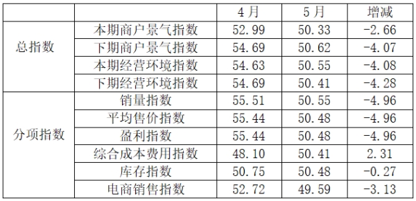 從商戶景氣指數(shù)來看,總指數(shù)中,5月商戶景氣指數(shù)為50.33,比4月的52.99下降2.66個(gè)百分點(diǎn);經(jīng)營環(huán)境指數(shù)為50.55,比4月的54.63下降4.08個(gè)百分點(diǎn)。