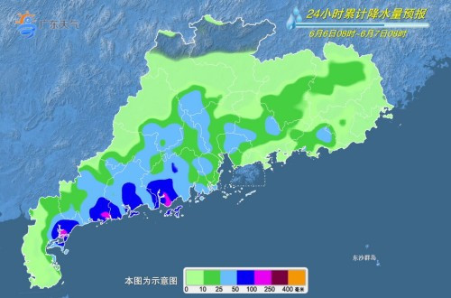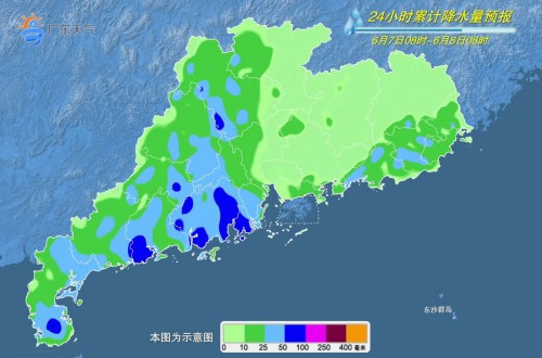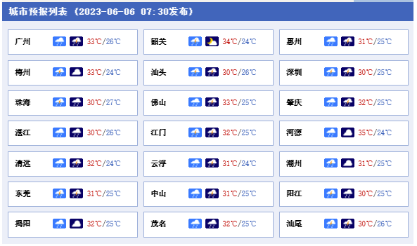 6日-7日,粵西和珠江三角洲市縣有中到強雷雨局部暴雨或大暴雨,其余市縣有雷陣雨局部大雨或暴雨。最高氣溫:粵西和沿海市縣30℃~32℃,其余大部分市縣33℃~35℃。