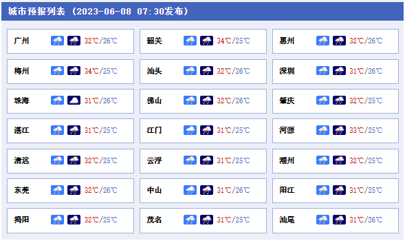 城市中,廣州今天白天多云,有雷陣雨;夜間多云間晴,有雷陣雨;氣溫介于25℃~33℃之間;相對(duì)濕度介于79%~96%之間;吹輕微至和緩的偏南風(fēng)。