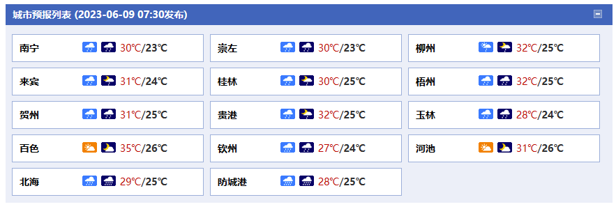 南寧市:今天白天到晚上,陰天有中雨,局部大雨到暴雨,東北風(fēng)3級(jí),最高氣溫30℃,最低氣溫23℃。