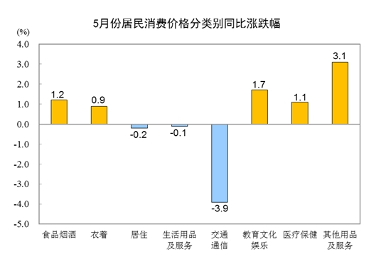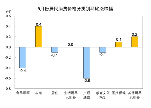 5月份,全國(guó)居民消費(fèi)價(jià)格環(huán)比下降0.2%。其中,城市下降0.2%,農(nóng)村下降0.2%;食品價(jià)格下降0.7%,非食品價(jià)格下降0.1%;消費(fèi)品價(jià)格下降0.2%,服務(wù)價(jià)格下降0.1%。