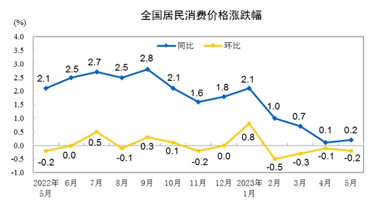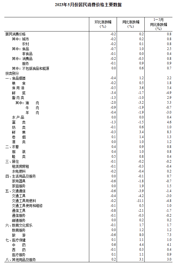 2023年5月份,全國(guó)居民消費(fèi)價(jià)格同比上漲0.2%。其中,城市上漲0.2%,農(nóng)村上漲0.1%;食品價(jià)格上漲1.0%,非食品價(jià)格持平;消費(fèi)品價(jià)格下降0.3%,服務(wù)價(jià)格上漲0.9%。1—5月平均,全國(guó)居民消費(fèi)價(jià)格比上年同期上漲0.8%。