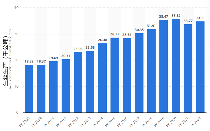 數(shù)據(jù)丨印度2008-2022財政年度生絲產(chǎn)量(單位:1000公噸)