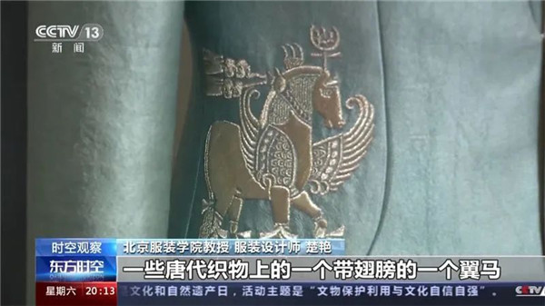 北京服裝學(xué)院教授、服裝設(shè)計(jì)師楚艷:我們發(fā)現(xiàn)了在新疆出土的一些唐代織物上的一個(gè)帶翅膀的翼馬,我們今天到中亞,比如像烏茲別克斯坦的一些壁畫,包括他們的古代紋樣當(dāng)中可能都能看到跟這個(gè)非常相似的,所以在絲綢之路上東西方的文化,包括服飾紋樣,包括制造技藝也是一直進(jìn)行著交融和碰撞。我們也是覺(jué)得非常具有開(kāi)放包容,東西方文明互鑒的一個(gè)理念。