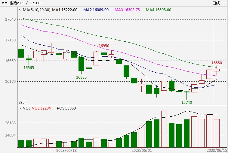 近期,生豬期貨價格有所反彈,但以主力及遠期合約為主。生豬主力2309合約上周五最低跌至15740元/噸,本周增倉上漲,反彈近1000元/噸。有市場人士表示,近月2307合約依舊疲弱,直觀地反映了目前生豬市場弱現(xiàn)實強預(yù)期的格局。
