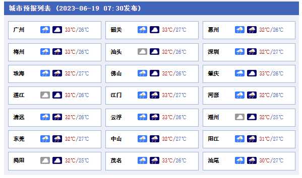 城市方面,廣州今天多云,有雷陣雨;氣溫26℃~33℃;相對(duì)濕度70%~95%;吹輕微的偏南風(fēng)。