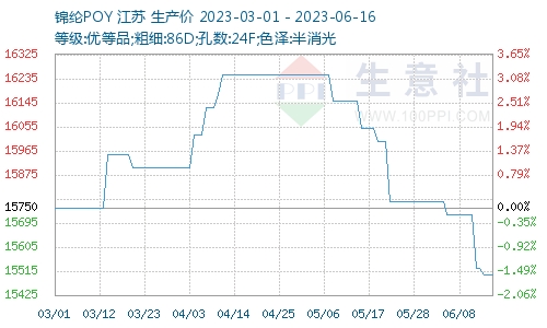據(jù)生意社商品行情分析系統(tǒng)顯示,本周(2023年6月12—16日),錦綸長(zhǎng)絲價(jià)格延續(xù)小幅下跌。截止2023年6月12日,江蘇地區(qū)錦綸長(zhǎng)絲DTY(優(yōu)等品;70D/24F)報(bào)價(jià)17860元/噸,較上周價(jià)格下跌100元/噸,周跌幅0.56%;錦綸POY(優(yōu)等品;86D/24F)報(bào)價(jià)15500元/噸,較上周價(jià)格下跌175元/噸,周跌幅1.43%;錦綸FDY(優(yōu)等品:40D/12F)價(jià)格報(bào)18500元/噸,較上周價(jià)格下跌100元/噸,周跌幅0.54%。