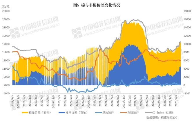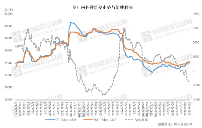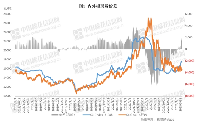 本周周內(nèi)國(guó)際棉價(jià)承壓下行。從影響因素來(lái)看,主產(chǎn)棉區(qū)天氣變化仍作為影響新棉生長(zhǎng)的主要變數(shù),對(duì)棉價(jià)存在一定支撐。但外圍市場(chǎng)歐洲央行政策鷹派主張繼續(xù)加息、美聯(lián)儲(chǔ)主席鮑威爾保持鷹派基調(diào)以及周內(nèi)公布的美國(guó)PMI、周初領(lǐng)失業(yè)金人數(shù)等相關(guān)經(jīng)濟(jì)數(shù)據(jù)均弱于市場(chǎng)預(yù)期,導(dǎo)致市場(chǎng)對(duì)經(jīng)濟(jì)衰退的擔(dān)憂情緒進(jìn)一步發(fā)酵,從而拖累棉價(jià)偏弱運(yùn)行。還需持續(xù)關(guān)注外圍市場(chǎng)波動(dòng)對(duì)棉價(jià)影響。本周外棉價(jià)格仍低于國(guó)內(nèi)棉價(jià),內(nèi)外棉價(jià)差仍保持高位區(qū)間。