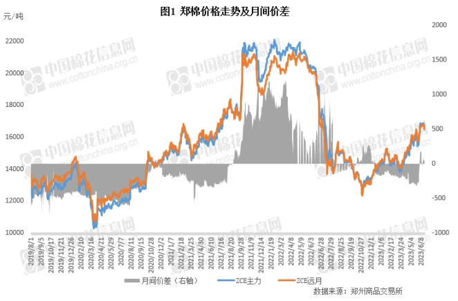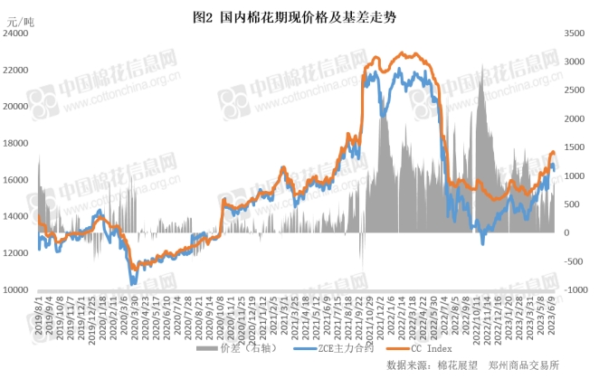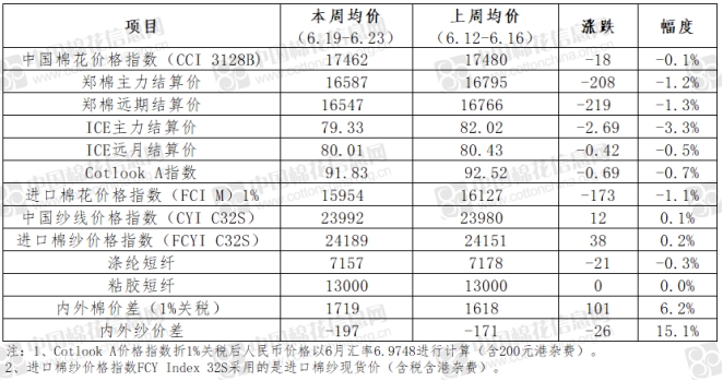 本周周內(nèi)鄭棉主力合約震蕩回調(diào),周三最低至16320,收于16350。從市場(chǎng)運(yùn)行情況來(lái)看,由天氣和庫(kù)存因素所發(fā)酵的供應(yīng)偏緊炒作有所減弱,而消費(fèi)端已出現(xiàn)走弱跡象,并且受端午假期影響,整體市場(chǎng)氛圍轉(zhuǎn)淡。從外圍市場(chǎng)來(lái)看,國(guó)內(nèi)宏觀仍有利好,LPR如期下調(diào),但前期已被市場(chǎng)基本消化,提振能力有限。再加上美聯(lián)儲(chǔ)主席鮑威爾在本周向國(guó)會(huì)作證時(shí)表示,美聯(lián)儲(chǔ)可能在未來(lái)幾個(gè)月內(nèi)繼續(xù)加息,市場(chǎng)加息預(yù)期回升,并且最新經(jīng)濟(jì)數(shù)據(jù)顯示出就業(yè)與經(jīng)濟(jì)的持續(xù)降溫,市場(chǎng)擔(dān)憂經(jīng)濟(jì)衰退情緒有所加強(qiáng)。從價(jià)格運(yùn)行情況來(lái)看,周內(nèi)鄭棉主力合約結(jié)算價(jià)周均價(jià)16587元/噸,較前一周下跌208元/噸,跌幅1.2%。