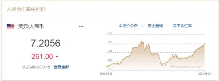 中國人民銀行授權中國外匯交易中心公布,6月26日人民幣對美元中間價報7.2056,下調261個基點。