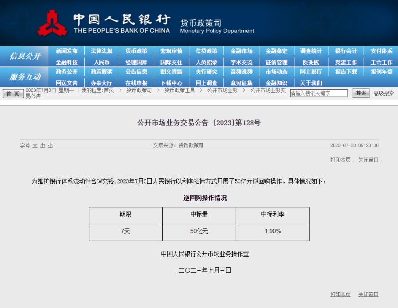 人民網(wǎng)北京7月3日電 (記者羅知之)據(jù)人民銀行官網(wǎng)消息,為維護(hù)銀行體系流動性合理充裕,人民銀行今日以利率招標(biāo)方式開展了50億元逆回購操作。期限七天,中標(biāo)利率1.9%。