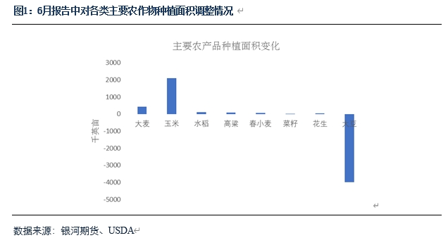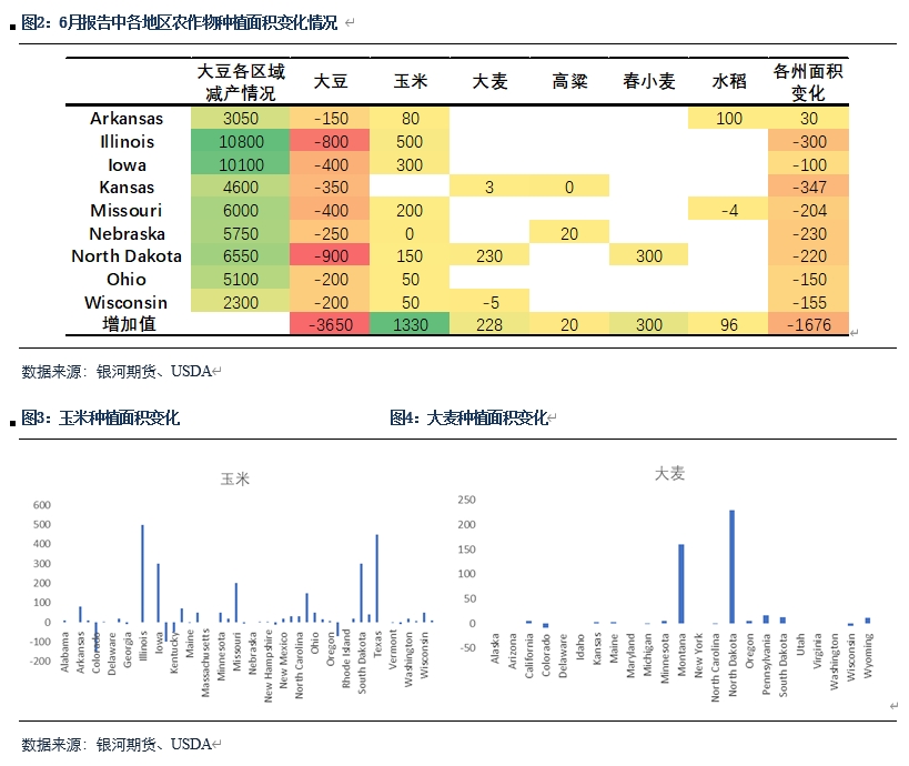 本次美豆種植面積大幅下調(diào)400萬英畝更多因替代所致。從總種植面積上看,6月種植面積3.187億英畝,而3月報(bào)告為3.181億英畝,因而本身并不存在惡劣天氣導(dǎo)致大幅減種的問題。當(dāng)我們對(duì)種植面積做進(jìn)一步細(xì)拆可以看到,除本次美豆種植面積下跌400萬英畝以外,玉米種植面積上調(diào)210萬英畝,大麥種植面積上調(diào)43.7萬英畝,高粱上調(diào)48萬英畝,春小麥種植面積增加30萬英畝,水稻種植面積上調(diào)15萬英畝(加州水稻為冬水稻,不計(jì)入種植競(jìng)爭(zhēng)考量),谷物方面整體增加337萬英畝。