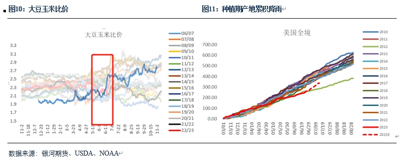 大豆價(jià)格的快速下跌可能是種植面積下滑的重要原因。從USDA的報(bào)告來看,2023年大豆種植主要在4月中旬到6月上旬這段時(shí)間,而在此期間是大豆價(jià)格快速回落的時(shí)間,美豆11月合約由此前1310美分一路下跌至6月上旬的1130美分,單邊累積跌幅達(dá)到13.7%,這直接影響到農(nóng)戶的種植利潤,從近年來利潤數(shù)據(jù)看,玉米較大豆種植利潤明顯改善。