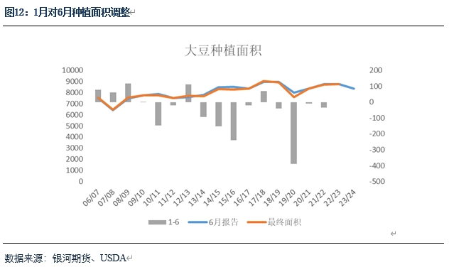 一般不出現(xiàn)重大影響的情況下,7-8-9月種植面積一般調(diào)整幅度不大,集中調(diào)整主要在10月定產(chǎn)的收割面積以及1月的面積調(diào)研上(含春季作物最終定產(chǎn)以及冬季作物定播種)。而從歷史來看,上述調(diào)整力度都不算很大。在此背景下,即使調(diào)低近年舊作出口進(jìn)度及新作結(jié)轉(zhuǎn)庫存,23/24年度美豆新作將變得較為緊張。在此背景下,南美需求的不利可能成為影響大豆上漲高度的主要因素,不過在市場(chǎng)關(guān)注重心在北美供應(yīng)的背景下,天氣的加持下,美豆偏強(qiáng)可能成為市場(chǎng)的主要旋律。