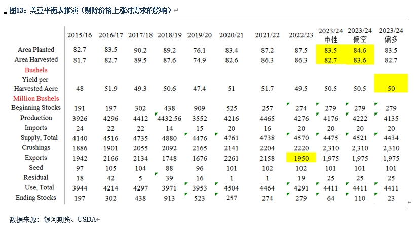 從當(dāng)前的作物優(yōu)良率狀態(tài)來看,7月報(bào)告中美豆單產(chǎn)大概率下調(diào)。而面積方面來看,對(duì)比歷史數(shù)據(jù),1月份最終種植面積較6月面積最大幅度上調(diào)在110+萬英畝左右。因此按照后續(xù)上調(diào)面積、調(diào)減單產(chǎn)、維持面積不變共分成三種情況推演來看,23/24年美豆平衡表將處于較為緊張狀態(tài),當(dāng)然,需要關(guān)注的是,本次報(bào)告調(diào)整中下調(diào)了舊作出口,同時(shí)因?yàn)槎唐谛伦麝P(guān)注焦點(diǎn)僅在供應(yīng)端,未對(duì)需求做直接調(diào)整。