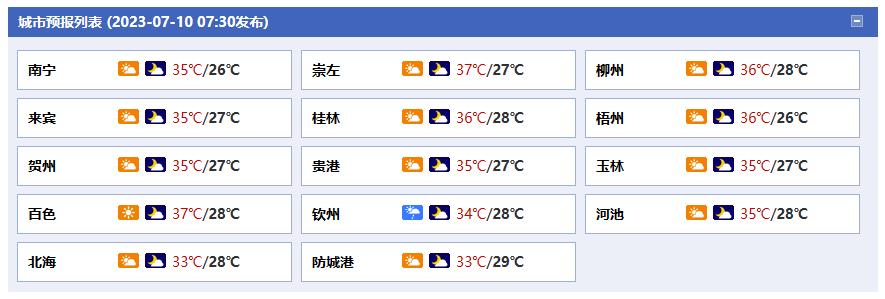 今天白天到晚上,百色、河池、防城港、欽州、北海等市的部分地區(qū)有陣雨或雷雨、局地大雨,我區(qū)其它地區(qū)多云到晴、局地有陣雨或雷雨。最高氣溫:全區(qū)大部34~36℃、局地37℃以上。