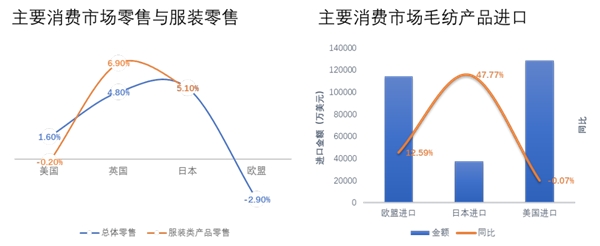 (注:美國(guó)、英國(guó)零售市場(chǎng)數(shù)據(jù)為5月數(shù)據(jù)、歐盟、日本零售市場(chǎng)為4月數(shù)據(jù);美國(guó)、日本毛紡進(jìn)口數(shù)據(jù)為1~5月數(shù)據(jù),歐盟毛紡進(jìn)口數(shù)據(jù)為1~3月數(shù)據(jù))