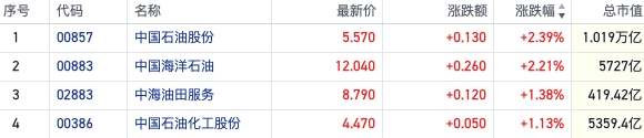 今日三桶油H股齊漲帶動港股石油板塊集體走高。截至發(fā)稿,中國海洋石油(00883.HK)、中國石油股份(00857.HK)雙雙漲超2%,中國石油化工股份(00386.HK)跟漲。
