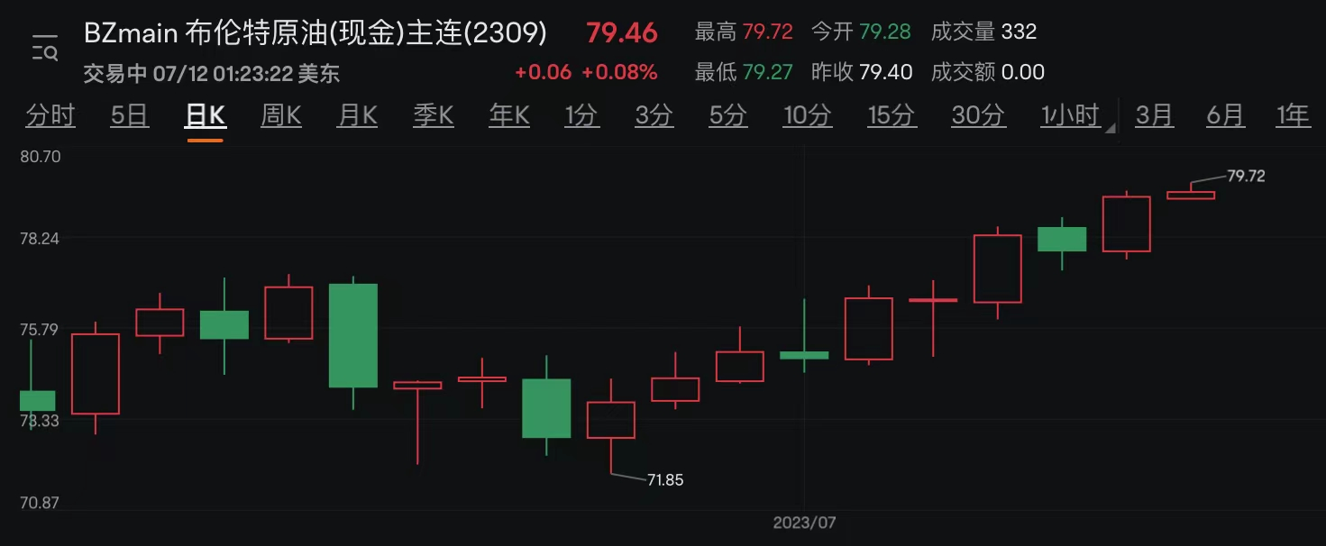 消息面上,國際油價短線強勢上行,重回近十周高位。截至發(fā)稿,WTI 8月原油期貨價格漲至每桶74.88美元,布倫特原油期貨價格則已接近80美元關(guān)口。