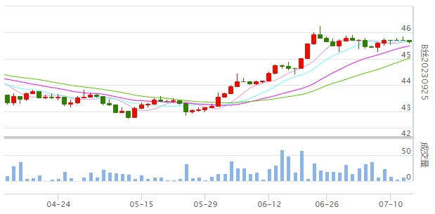 今日(2023年07月13日,周四)中國繭絲綢交易市場(chǎng)生絲指數(shù)下跌0.14%收于4591.54點(diǎn)。B絲(商檢4A級(jí)生絲):230725合約下跌0.09萬元報(bào)收于45.45萬元;230925合約下跌0.06萬元報(bào)收于45.66萬元;240325合約下跌0.06萬元報(bào)收于46.77萬元。