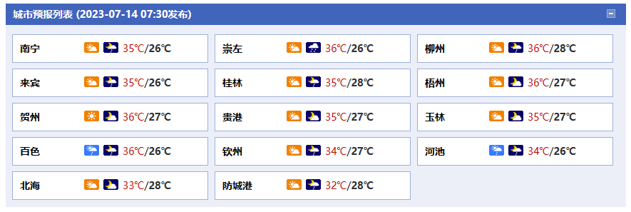 南寧市:今天白天多云、局地有陣雨或雷雨,今天晚上多云有陣雨或雷雨,南轉(zhuǎn)北風(fēng)1~2級,最高氣溫35℃,最低氣溫26℃。