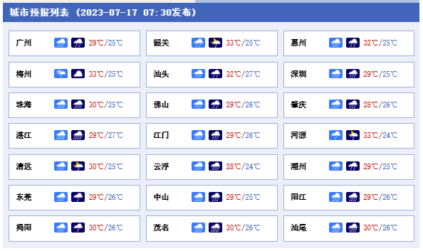 城市方面,廣州今天,陰天,有大雨局部暴雨;氣溫24℃~30℃;相對(duì)濕度在65~95%之間。