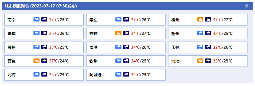 南寧市:今天白天多云轉(zhuǎn)陣雨或雷雨,今天晚上有大雨、局地暴雨,東北風3~4級,局地陣風6~8級,最高氣溫37℃,最低氣溫25℃。
