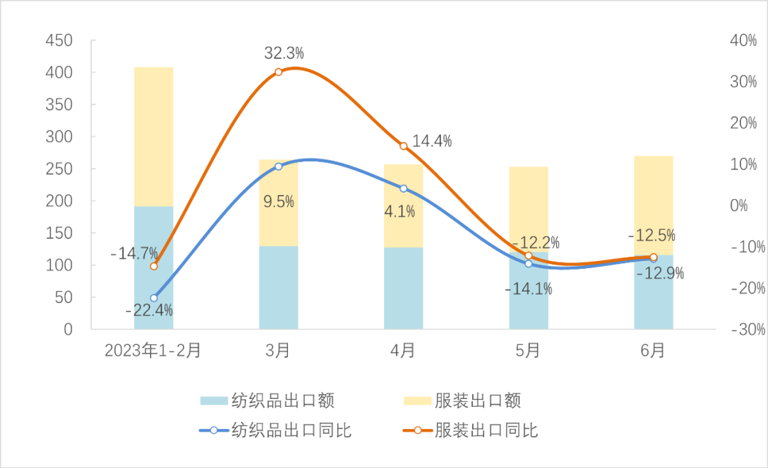 今年二季度以來,行業(yè)外貿(mào)形勢較為嚴(yán)峻,4月我國紡織品服裝出口額同比增速明顯放緩,并于5月落入負(fù)增長區(qū)間。6月當(dāng)月,我國紡織品服裝對全球出口269.9億美元,同比減少12.7%(以人民幣計(jì)同比下降8.8%),降幅較上月略有收窄。其中,紡織品出口115.7億美元,同比減少12.9%(以人民幣計(jì)同比減少9%);服裝出口154.2億美元,同比下降12.5%(以人民幣計(jì)同比減少8.7%)。