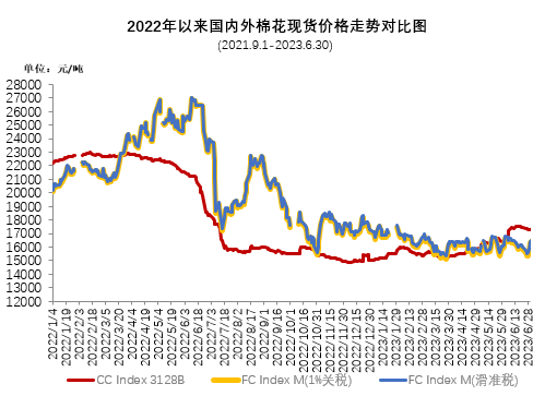 6月,受供應(yīng)偏緊、新棉減產(chǎn)預(yù)期等因素影響,國(guó)內(nèi)棉價(jià)在前半月快速上行,月中創(chuàng)本年度以來(lái)新高,之后因紡織處于市場(chǎng)淡季、企業(yè)開(kāi)機(jī)率不足,棉價(jià)小幅回調(diào)。月內(nèi),隨著國(guó)內(nèi)棉花現(xiàn)貨價(jià)格上漲,棉花企業(yè)多上調(diào)銷售價(jià)格,紡織企業(yè)則為降低成本增加了進(jìn)口棉的采購(gòu)量,并試探性上調(diào)棉紗報(bào)價(jià),但下游接受度有限,棉紗價(jià)格上漲幅度較緩,紡織成品因新增訂單轉(zhuǎn)弱,成品庫(kù)存緩慢增加。同期,受美國(guó)主要棉區(qū)旱情持續(xù)轉(zhuǎn)好、美聯(lián)儲(chǔ)加息等因素影響,國(guó)際棉價(jià)總體震蕩下行,月底有所反彈,內(nèi)外棉價(jià)差持續(xù)擴(kuò)大。