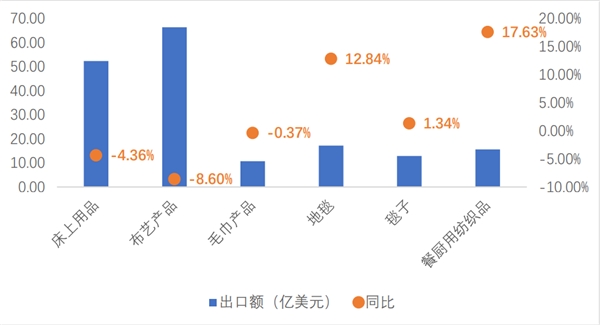 圖2. 2023年1-5月我國(guó)家用紡織品主要大類產(chǎn)品出口額及同比