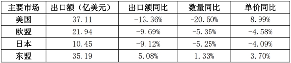 表1.2023年1-5月我國(guó)家用紡織品對(duì)美、歐、日及東盟市場(chǎng)出口情況