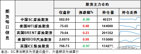 【1】WTI主力原油期貨收漲0.36美元,漲幅0.48%,報75.65美元/桶;布倫特主力原油期貨收漲0.18美元,漲幅0.23%,報79.64美元/桶;INE原油期貨收跌0.99%,報582.8元。