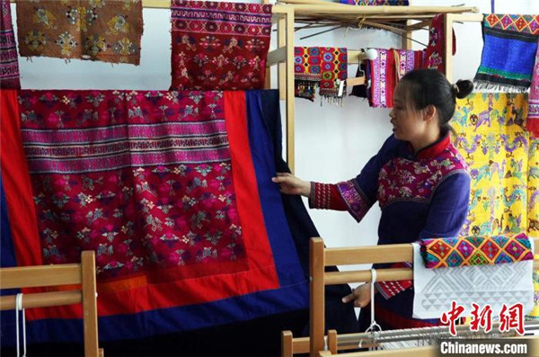 “我從事毛南族織錦有12年了,我想把毛南錦融入到我們的生活中來(lái),讓更多人了解毛南錦,了解毛南族的傳統(tǒng)文化?!泵甥愒僬f(shuō)。