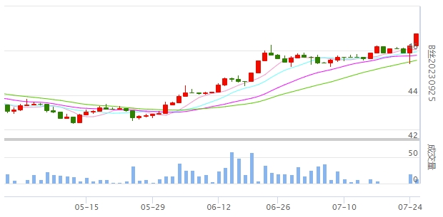 今日(2023年07月25日,周二)中國繭絲綢交易市場生絲指數(shù)上漲0.84%收于4678.04點。B絲(商檢4A級生絲):230825合約上漲0.36萬元報收于46.17萬元;230925合約上漲0.54萬元報收于46.77萬元;240325合約上漲0.42萬元報收于47.97萬元。