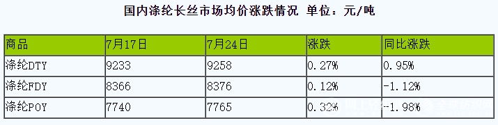 近期國內(nèi)滌綸長絲市場行情漲勢有所放緩,據(jù)生意社商品行情分析系統(tǒng),截止7月24日江浙地區(qū)主流滌綸長絲工廠,滌綸POY(150D/48F)報價在7550-8100元/噸,滌綸DTY(150D/48F低彈)報價在8950-9350元/噸,滌綸FDY(150D/96F)報價在8250-8700元/噸。